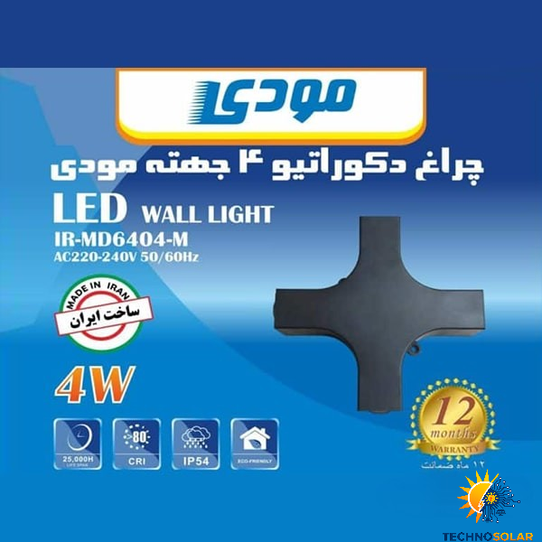 چراغ دکوراتیو 4 جهته مودی یک دکوراتیو فانتزی است که به زیبایی دیوار میافزاید. این چراغ در رنگ آفتابی موجود است و بدون نیاز به ترانس یا درایور، به طور مستقیم به ولتاژ برق متصل میشود.