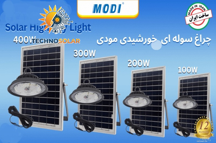 چراغ آویز خورشیدی SMD مودی که با نام چراغ سولهای سولار (Solar High Bay Light) نیز شناخته میشود، یکی از محصولات پرفروش و کاربردی برند مودی است. این چراغها در مدلهای IR-MD74100، IR-MD74200، IR-MD74300 و IR-MD74400 عرضه میشوند و توان مصرفی آنها بهترتیب ۱۰۰ وات، ۲۰۰ وات، ۳۰۰ وات و ۴۰۰ وات است.